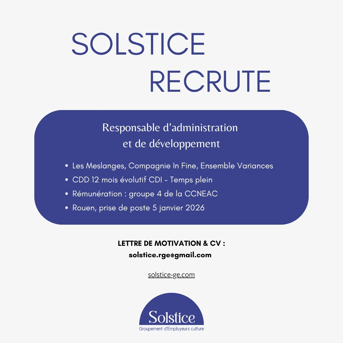 L’association Solstice, créée en 2011, est un réseau normand qui promeut les musiques de répertoire et de création  (depuis le répertoire médiéval à la création d’aujourd’hui), soutenant la création d’emplois durables dans ce  domaine. En tant que Groupement d’Employeurs, elle réunit des structures culturelles pour mutualiser des emplois,  structurer leurs activités et développer leurs projets, contribuant ainsi au rayonnement culturel de la Normandie.